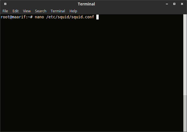 3. Setelah squid nya terinstall , kemudian kita konfigurasi dengan masuk ke perintah .